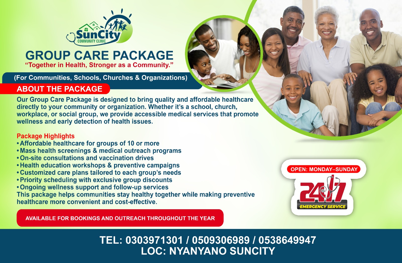 Our Group Care Package is designed to bring quality and affordable healthcare directly to your community or organization. Whether it’s a school, church, workplace, or social group, we provide accessible medical services that promote wellness and early detection of health issues.